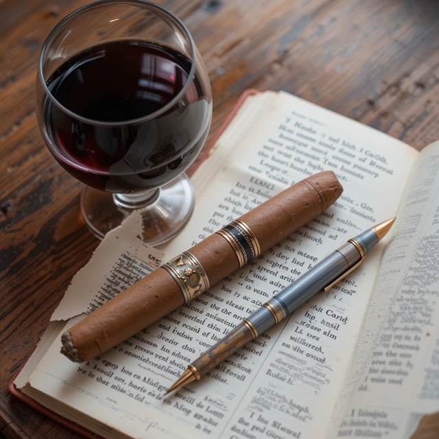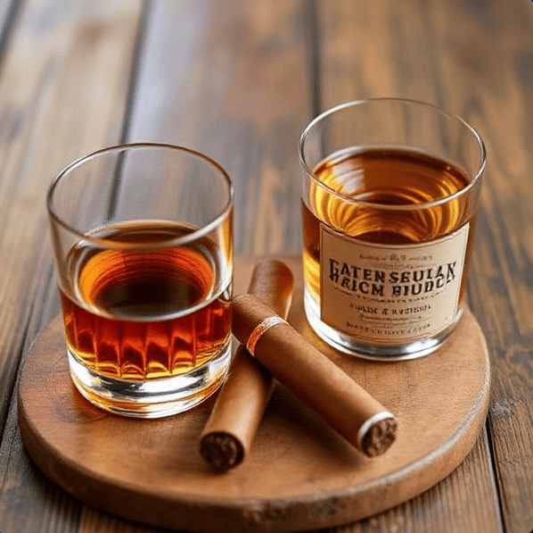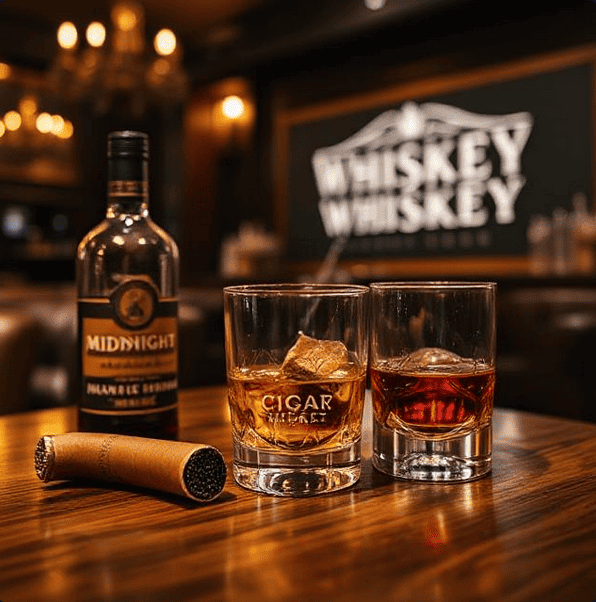 Taste rare cigars alongside aged whiskeys in a dimly lit, velvet-accented lounge. Gentle jazz in the background. Sophisticated company in the foreground.